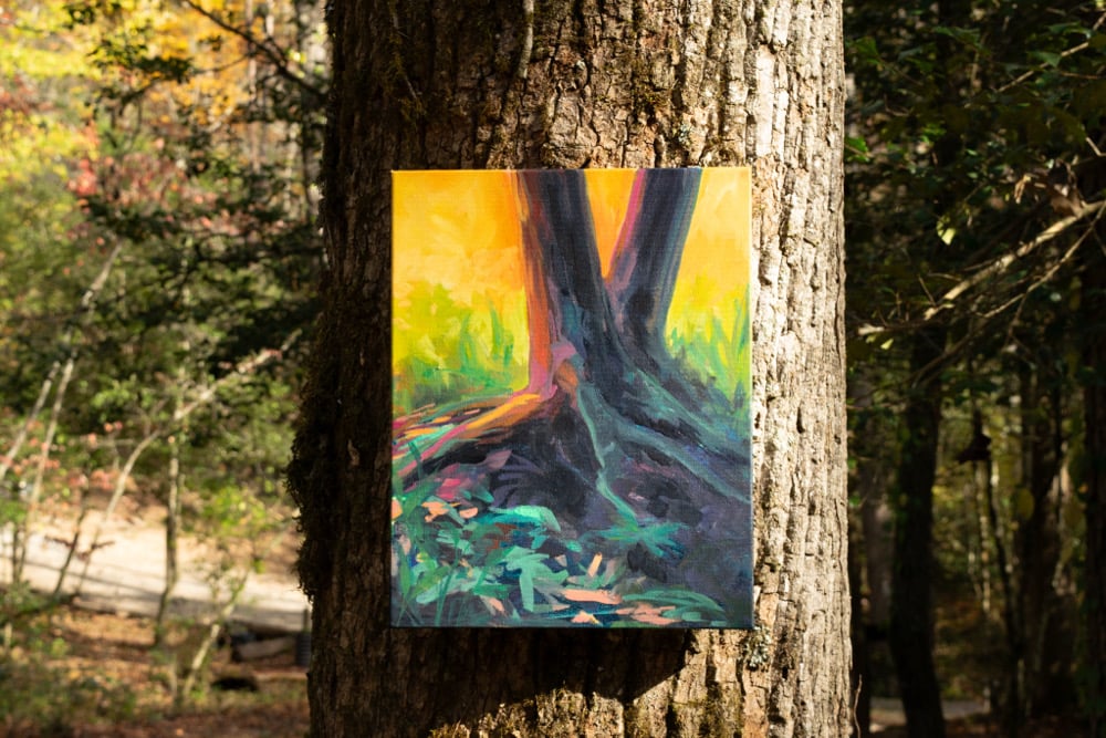 Rachel and Reneé pulled inspiration from both the Midwest and the North Georgia Mountains taking a dual perspective approach to the compositions. The challenge of working together on the canvases, often simultaneously, caused both artists to adapt their styles and focus on the harmonization of both as they built up unique layers that meshed as the paintings were completed.