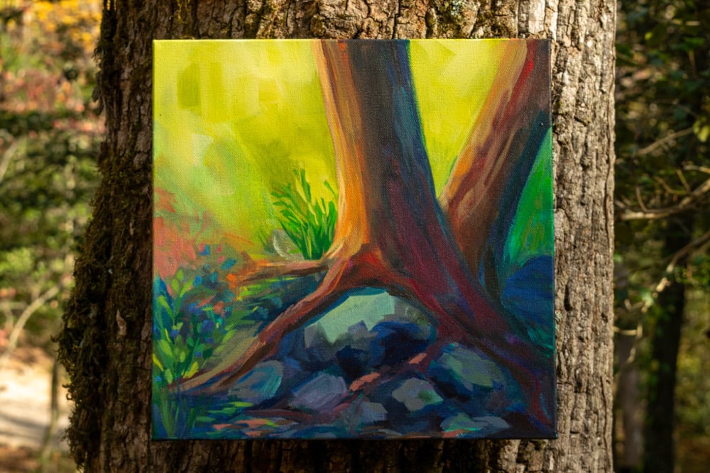 Rachel and Reneé pulled inspiration from both the Midwest and the North Georgia Mountains taking a dual perspective approach to the compositions. The challenge of working together on the canvases, often simultaneously, caused both artists to adapt their styles and focus on the harmonization of both as they built up unique layers that meshed as the paintings were completed.